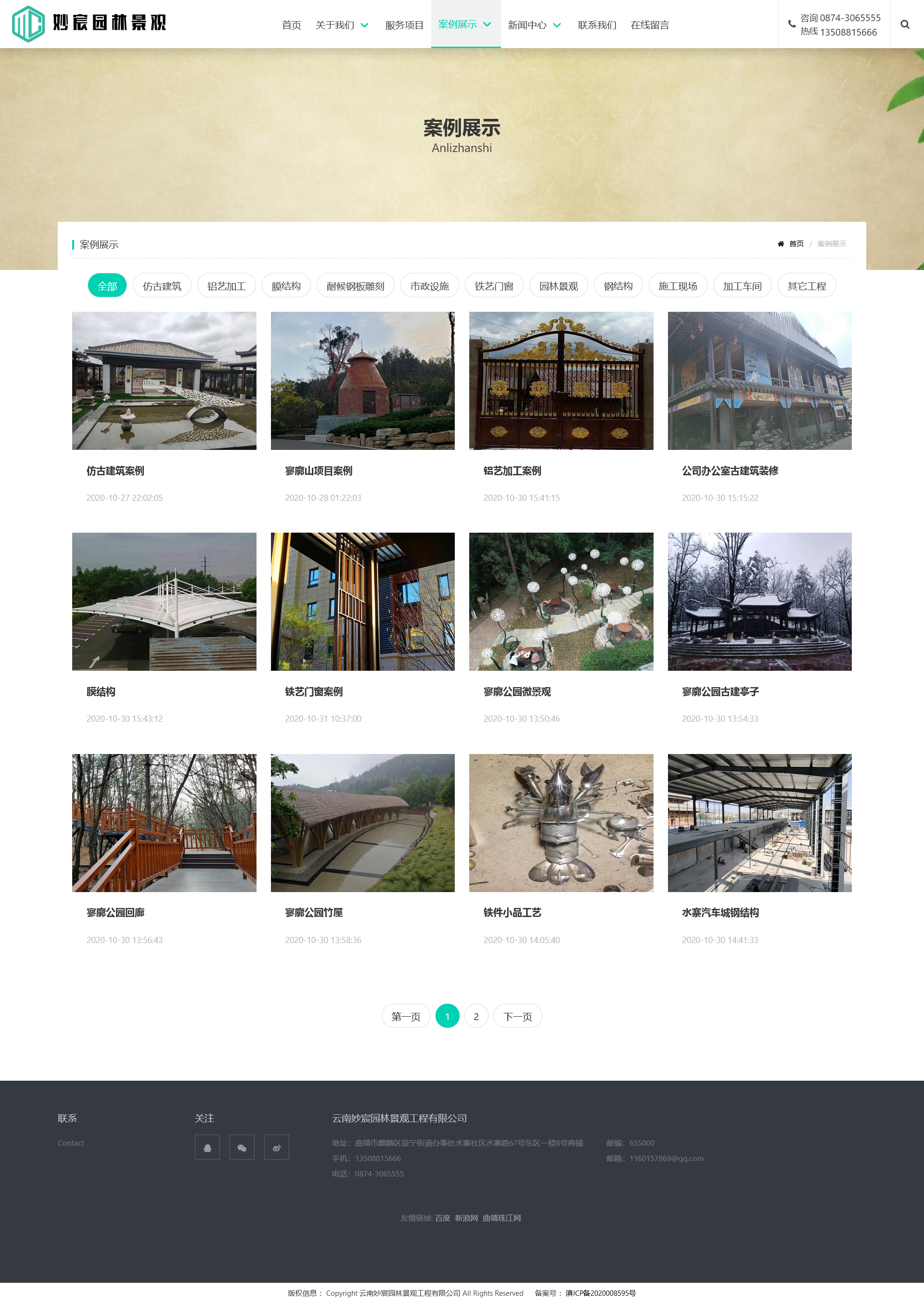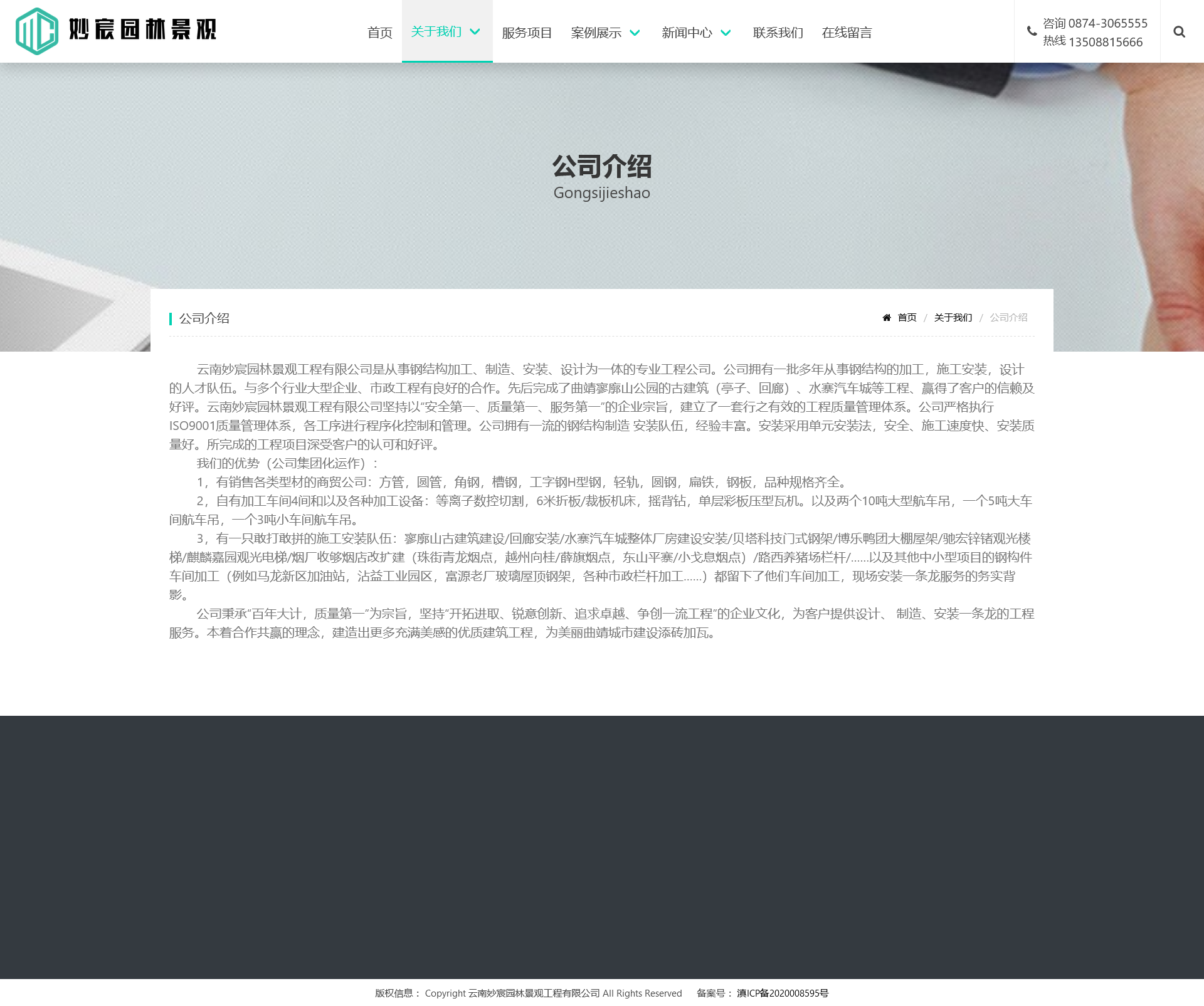 云南妙宸园林景观工程有限公司是从事钢结构加工、制造、安装、设计为一体的专业工程公司。公司拥有一批多年从事钢结构的加工,施工安装,设计的人才队伍。与多个行业大型企业、市政工程有良好的合作。先后完成了曲靖寥廓山公园的古建筑(亭子、回廊)、水寨汽车城等工程、赢得了客户的信赖及好评。云南妙宸园林景观工程有限公司坚持以“安全第一、质量第一、服务第一”的企业宗旨,建立了一套行之有效的工程质量管理体系。公司严格执行ISO9001质量管理体系,各工序进行程序化控制和管理。公司拥有一流的钢结构制造 安装队伍,经验丰富。安装采用单元安装法,安全、施工速度快、安装质量好。所完成的工程项目深受客户的认可和好评。